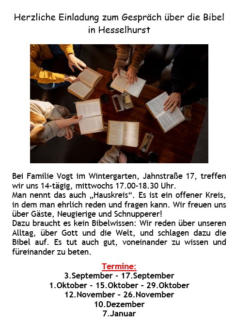 und in Hesselhurst bei Familie Vogt, Jahnstr. 1. Die Termine lesen Sie im Mitteilungsblatt oder auf den Flyer, welche in beiden Kirchen ausliegen. Jeder darf kommen – unabhängig von seinem Bibelwissen und Glaubensstand 😉