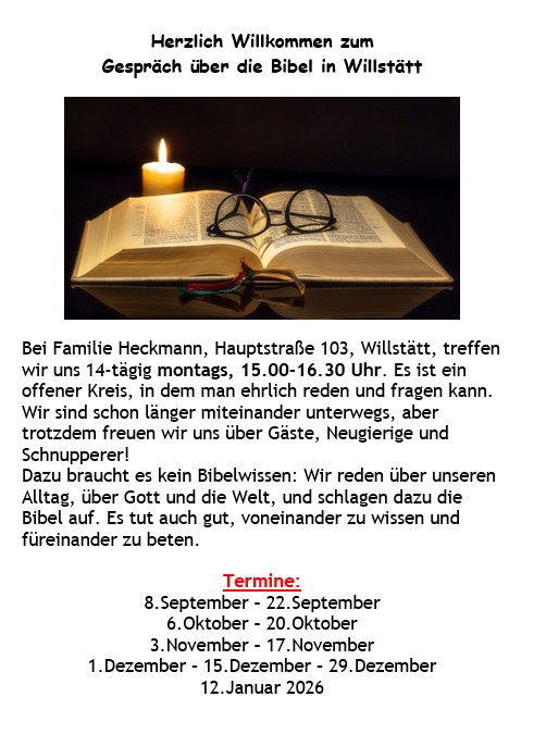 Im Bibelgesprächskreis stellen wir Fragen und schlagen dazu die Bibel auf. Meistens treffen wir uns in der Regel im 14-tägigen Rhythmus. In Willstätt montags 15.00 – 16.30 Uhr (in der Winterzeit bei Familie Heckmann, Hauptstr. 103, ab der wärmeren Jahreszeit im Gemeindehaus)